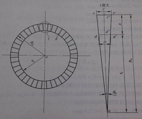 20世紀(jì)40年代中期,比較流行的一種回轉(zhuǎn)窯高爐環(huán)形砌磚設(shè)計(jì)中,粘土磚的尺寸采用同時(shí)等分磚環(huán)內(nèi)外圓周長(zhǎng)的方法計(jì)算(如圖)。將設(shè)計(jì)外半徑R0及內(nèi)半徑r0的磚環(huán)的外圓周長(zhǎng)Ow=2πr0同時(shí)等分:高爐楔形磚的大端寬度尺寸C=2πR0/K-δ,小端寬度尺寸D=2πr0/K-δ,K為該磚環(huán)的楔形磚數(shù)量,δ是磚環(huán)的輻射豎縫厚度。